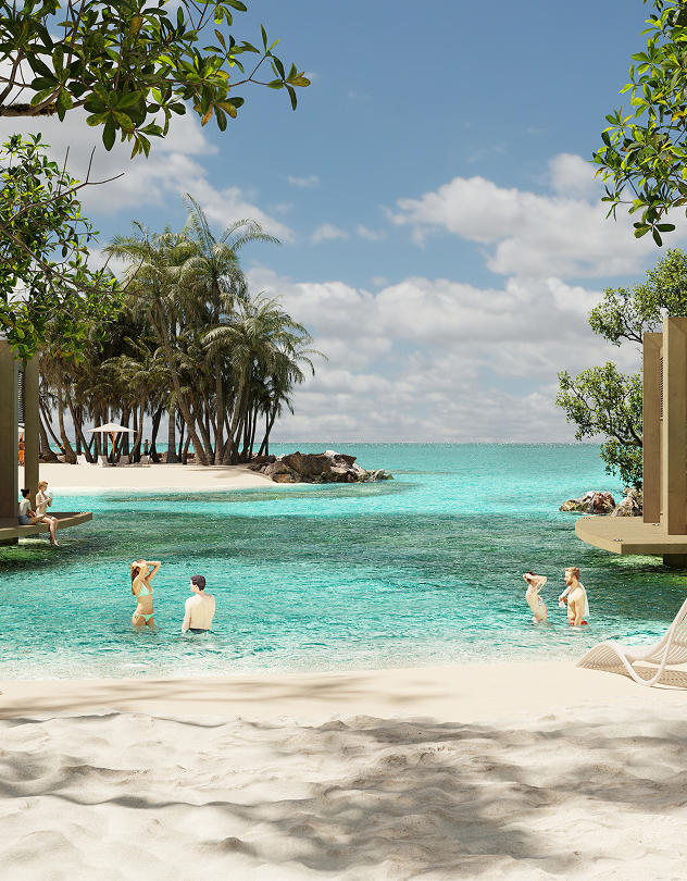 A serene wellness center, infinity pools, water sports, private gazebos, gourmet dining, lush gardens and a tropical island.
